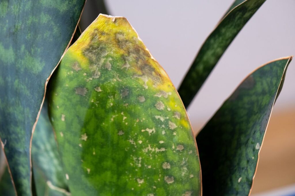 Snake plants may also occasionally develop brown or black spots on the leaves due to the following issues: