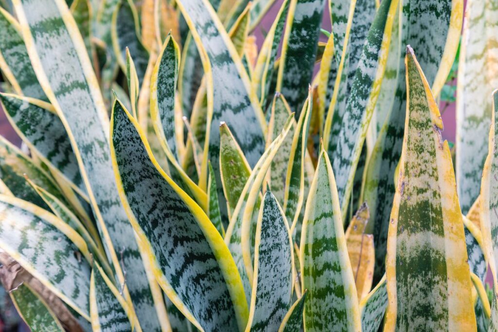 Snake plants are valued for their unique leaf variegations and/or yellow or cream margins.